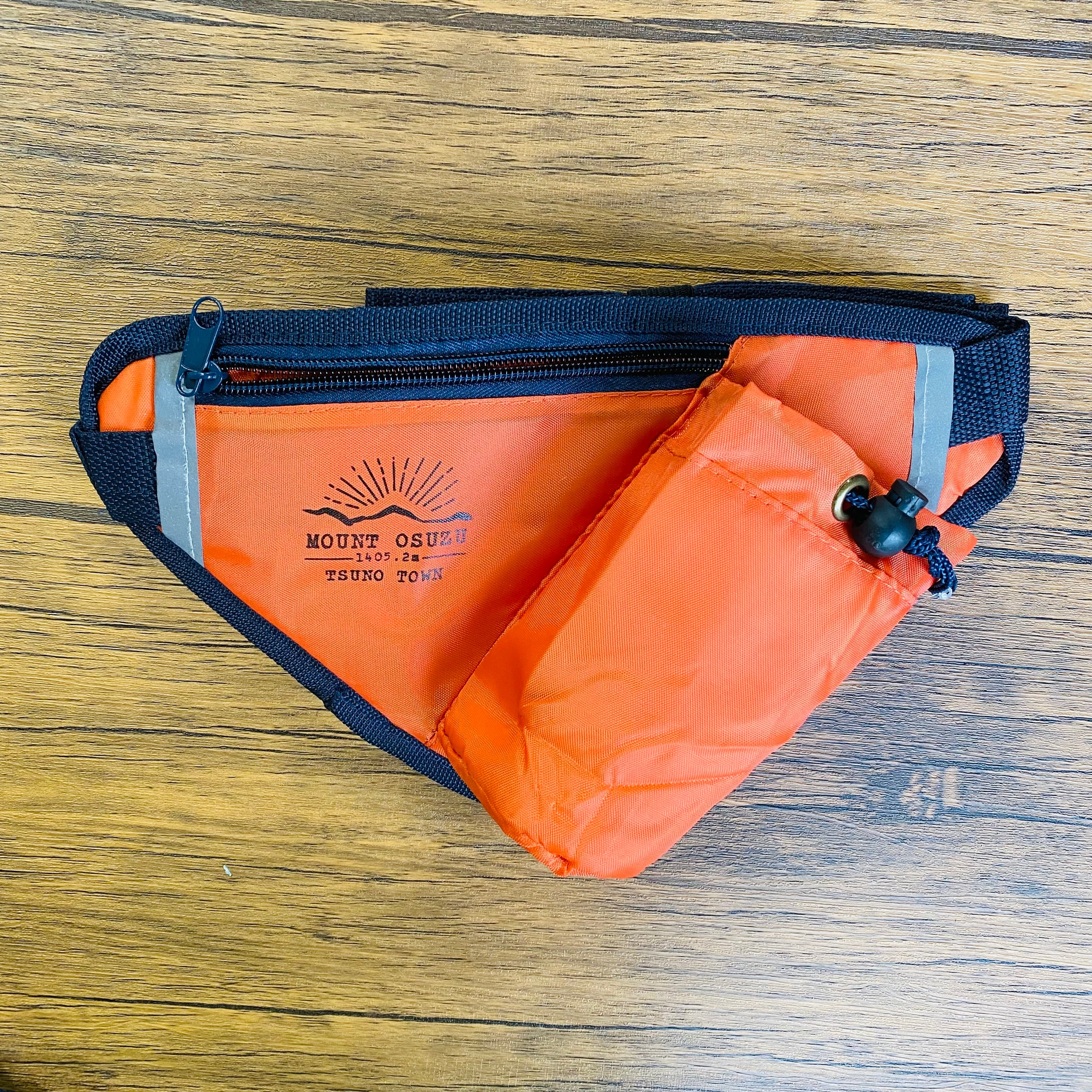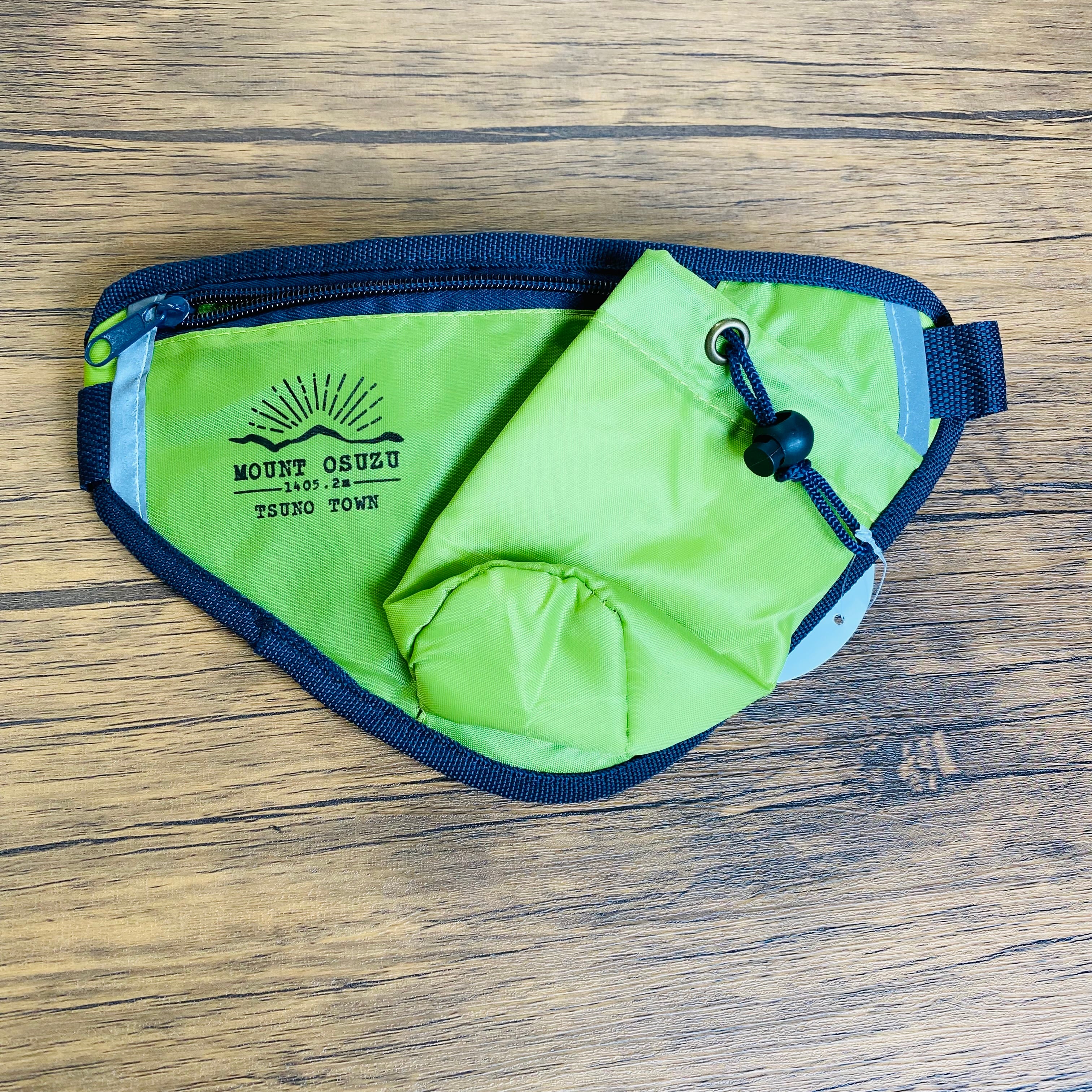 肩に掛けてショルダーポーチ、腰に巻いてウエストポーチどちらにも使える2WAYタイプで、ペットボトルホルダーとチャックのついたポーチ部分があり、両サイドには反射テープがついています。